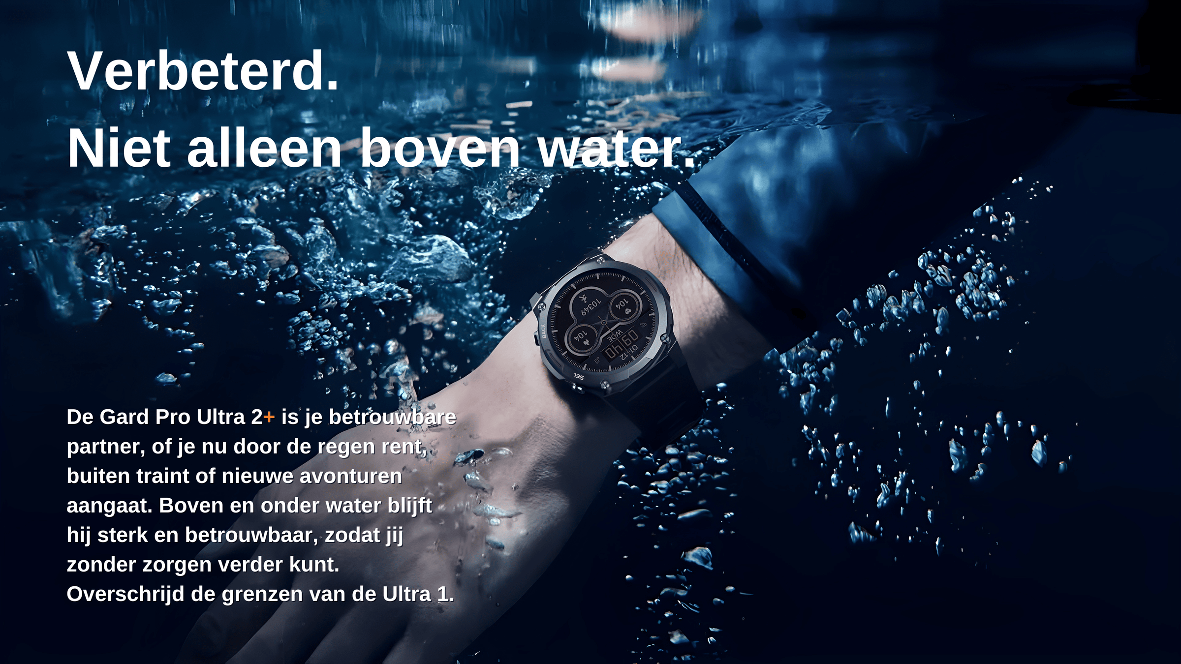 De Ultra 2+ heeft een batterijlevensduur die 17% langer is dan zijn voorganger en beschikt over een 1,43-inch Ultra HD AMOLED-scherm met 1000 nits helderheid, beschermd door Corning® Gorilla Glass. De ultra 2+ is MIL-STD-810G gecertificeerd, na het succesvol doorstaan van 12 militaire duurzaamheidstests. De behuizing van het horloge is robuuster en het bandje is versterkt. Daarnaast is de nauwkeurigheid van gezondheidsmetingen met 36% toegenomen dankzij verbeterde biometrische sensoren